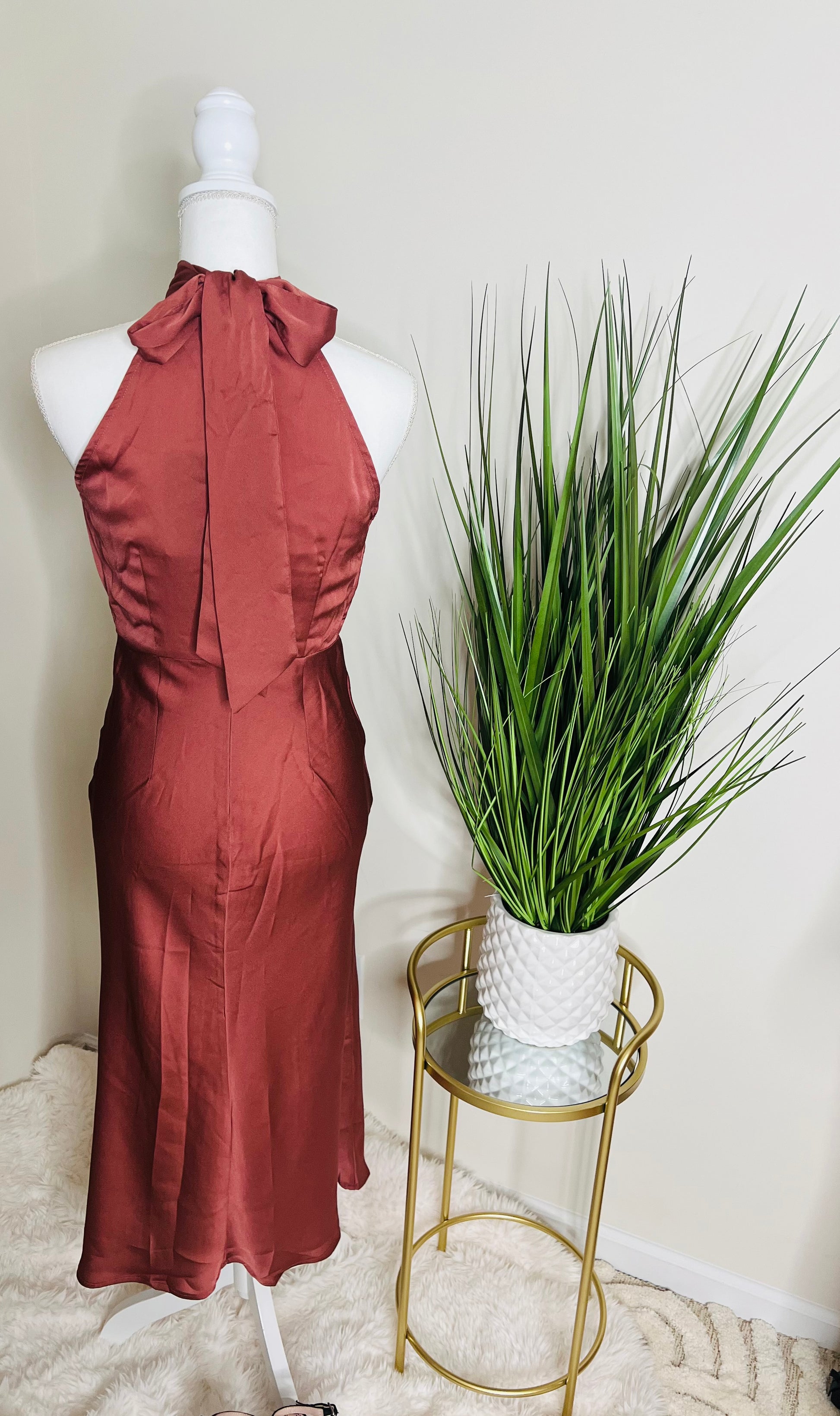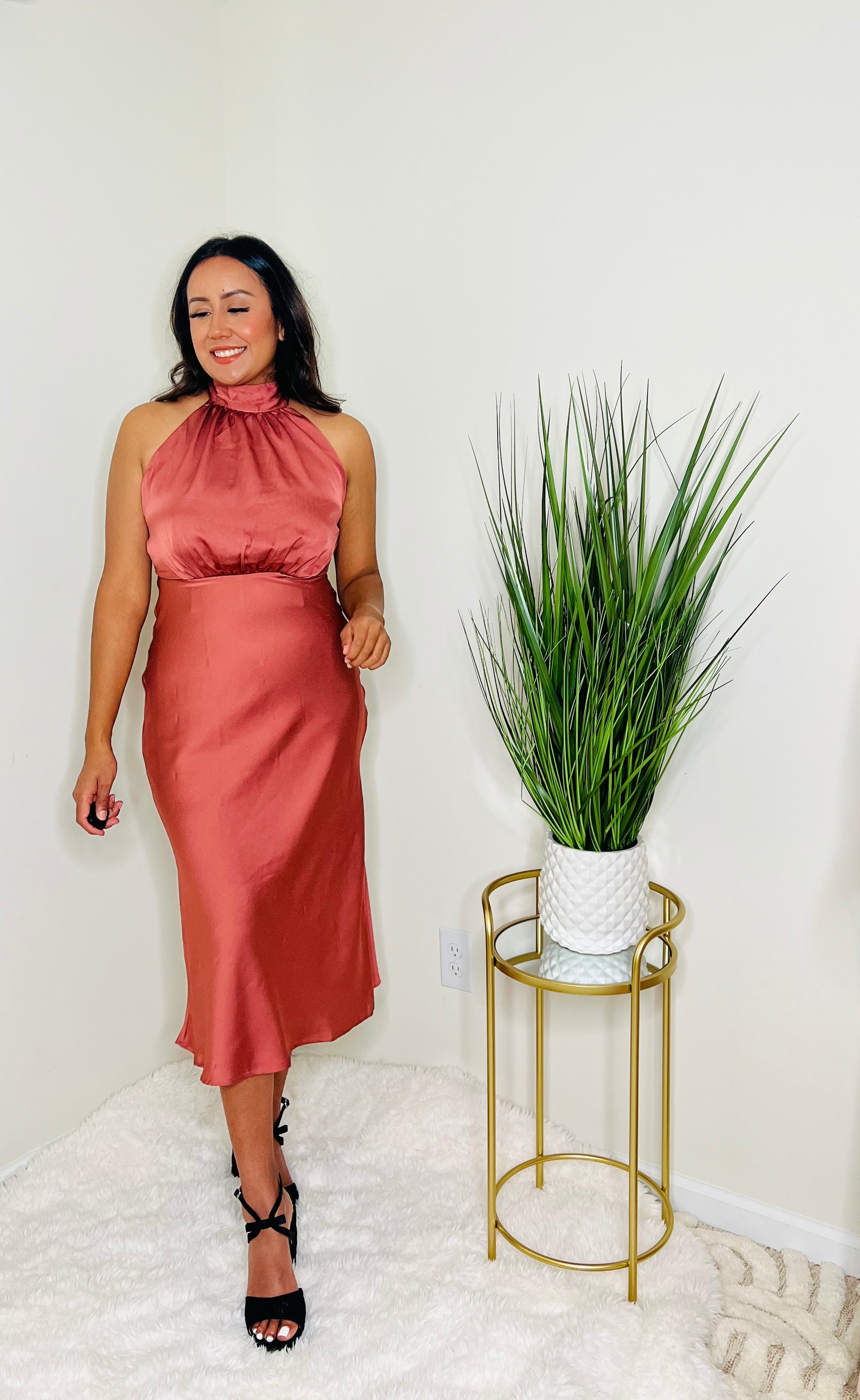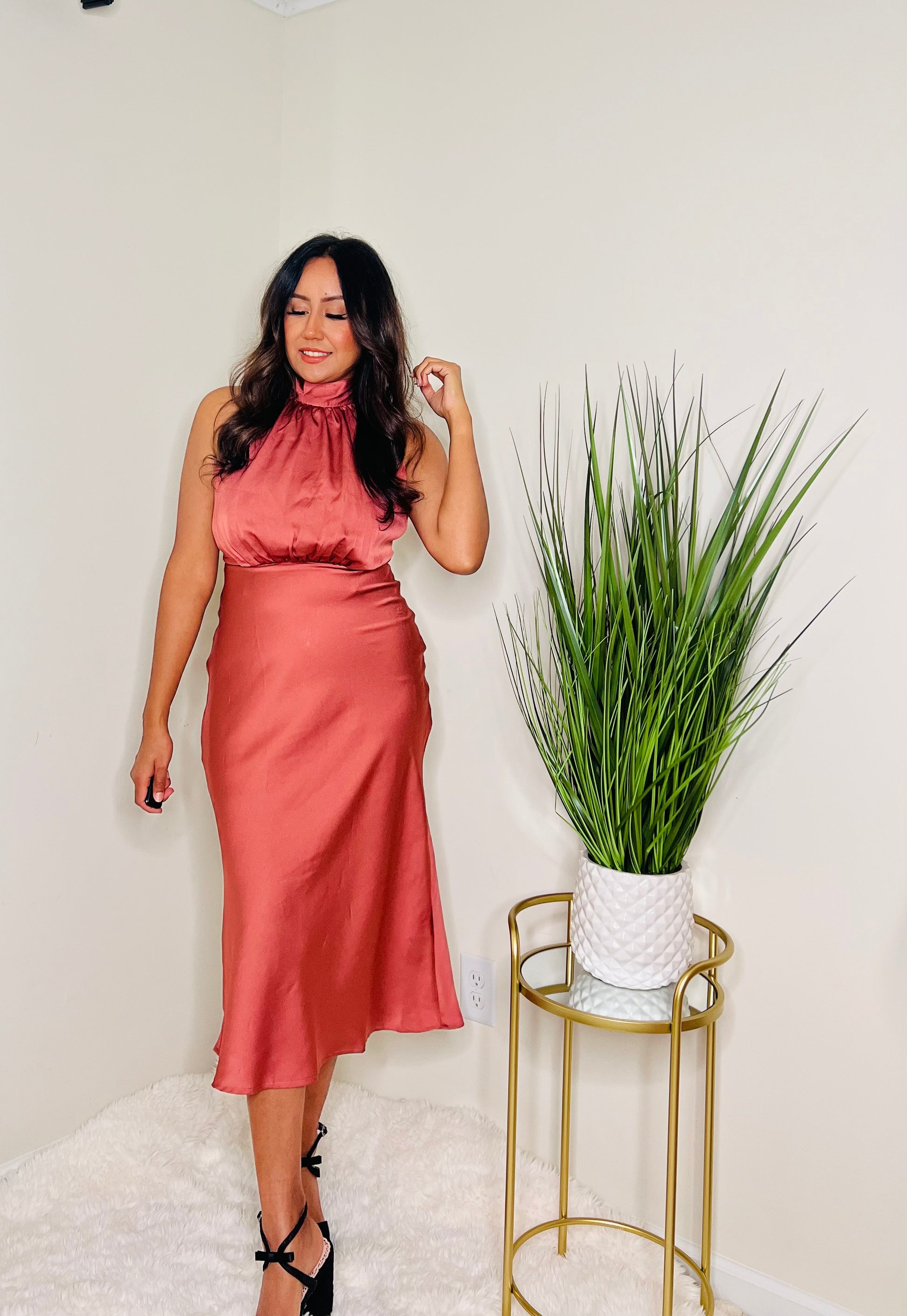 Muave Mock Neck Satin Midi Dress